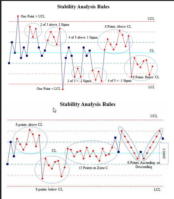There are a few different sets of rules that can be used in SPC analysis, but one commonly used set is called the Western Electric rules or the Nelson rules. These rules are used to identify when a process is out of control and may require corrective action. There are six basic rules in the Western Electric or Nelson set: